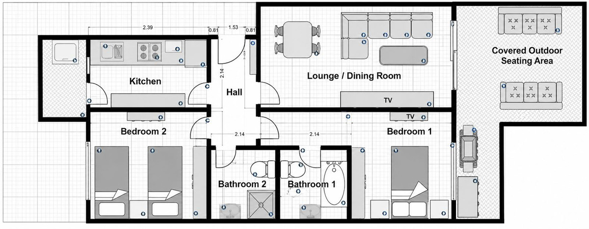 Les deux chambres donnent sur le couloir central. La chambre principale comprend des placards intégrés et une salle de bains privative avec baignoire, tandis que la seconde chambre dispose également de placards intégrés et d'un balcon Juliette donnant sur la piscine, les jardins et le parc.