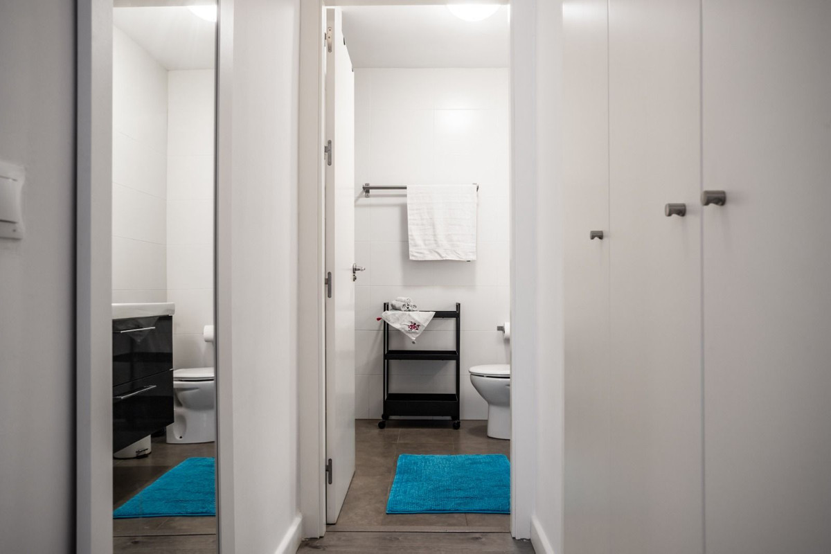 L'appartement se compose d'un hall d'entrée, d'un salon lumineux avec cuisine ouverte et accès à la terrasse, d'une chambre avec salle de bains attenante et placards intégrés, d'une autre chambre avec placards et d'une deuxième salle de bains.