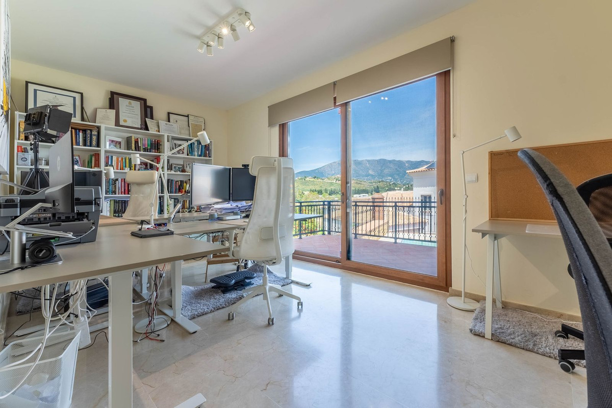 À l'étage, deux chambres avec salle de bains privative et une suite parentale spectaculaire avec salle de bains ouverte, de nombreux rangements et une vue imprenable sur la Sierra de Mijas, les plantations d'avocatiers et la mer. La propriété compte au total six salles de bains.